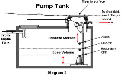 Your Septic System has an effluent pump which pumps the effluent into the drain field. The location of this pump would be either on the 2nd cell of a combination septic tank OR in a separate concrete tank behind the septic tank.